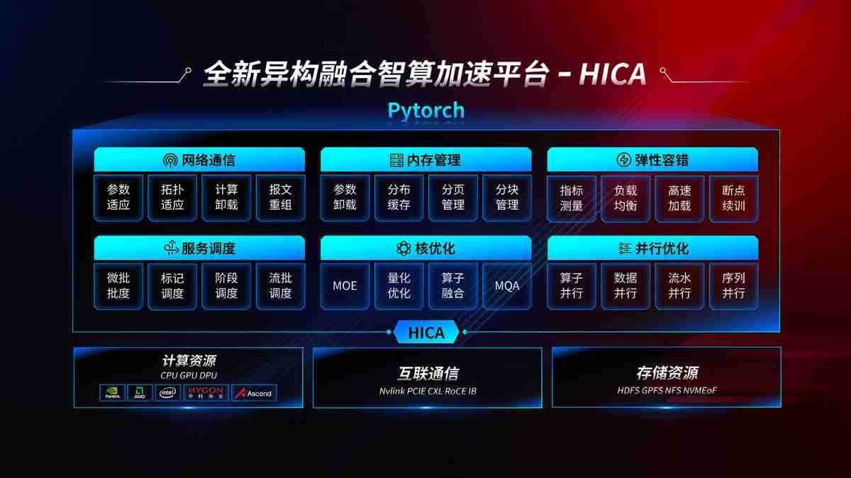 通过自研的服务层、、、、中间适配层、、、以及调度编排算法,,采用数据并行、、、、模型并行等多种并行方式,,把并行计算任务进行有效的分解,,使其分别由相应的软件栈和算力资源来承接。。当GPU资源变化,,,,HICA可以实时动态调度计算子任务并调整模型拓扑和架构,,,以充分聚合各种算力资源。。
