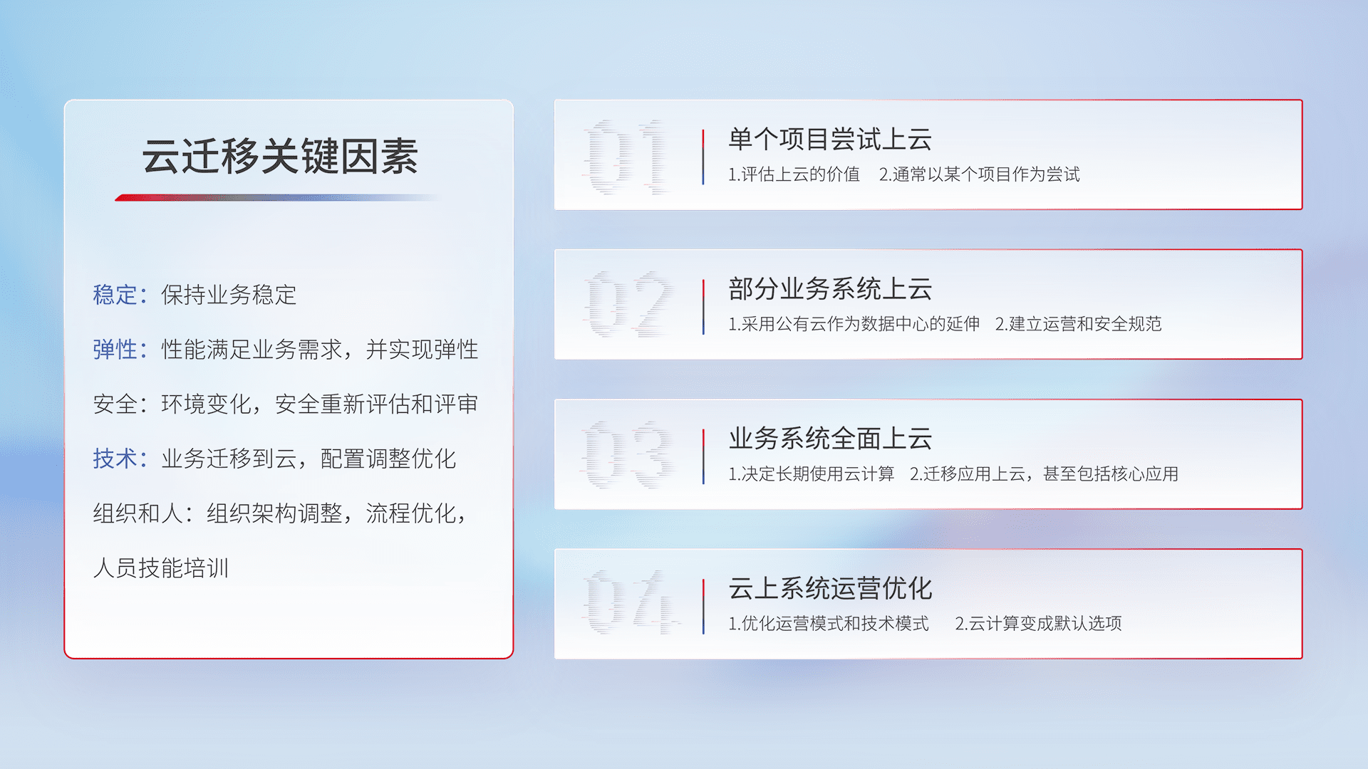 结合实际业务,,从规划设计、、、、云平台选型、、、、云原生改造、、、数据迁移、、、集成交付,,迁移全过程为客户识别最佳上云路径,,,,做好风险识别管理,,,,设计网络架构、、、、身份权限、、、安全审计合规、、操作审计、、、日志审计、、监控告警策略、、多站点容灾设计等,,,,对云上基础设施进行整体规划,,,提升IT治理水平,,以满足弹性、、、、高可用、、、、高性能的需求。。。。