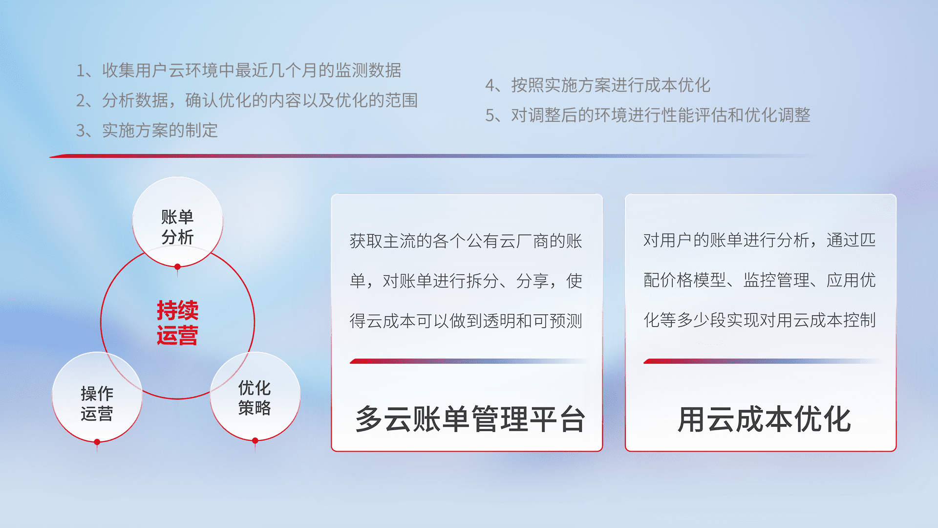 通过多云纳管,,,,以统一的资源数据模型把客户的云资源进行抽象和封装,,进而实现对多云资源的统一操作,,,,保障云资源管理的可靠性、、稳定性与可用性。。。量身定制化运维内容,,配置、、开发运维、、、、补丁管理、、备份、、、、监控、、认证和访问管理、、、审计和日常巡检等,,保障在用云过程中的可靠度,,,稳定度以及高可用率。。。。
